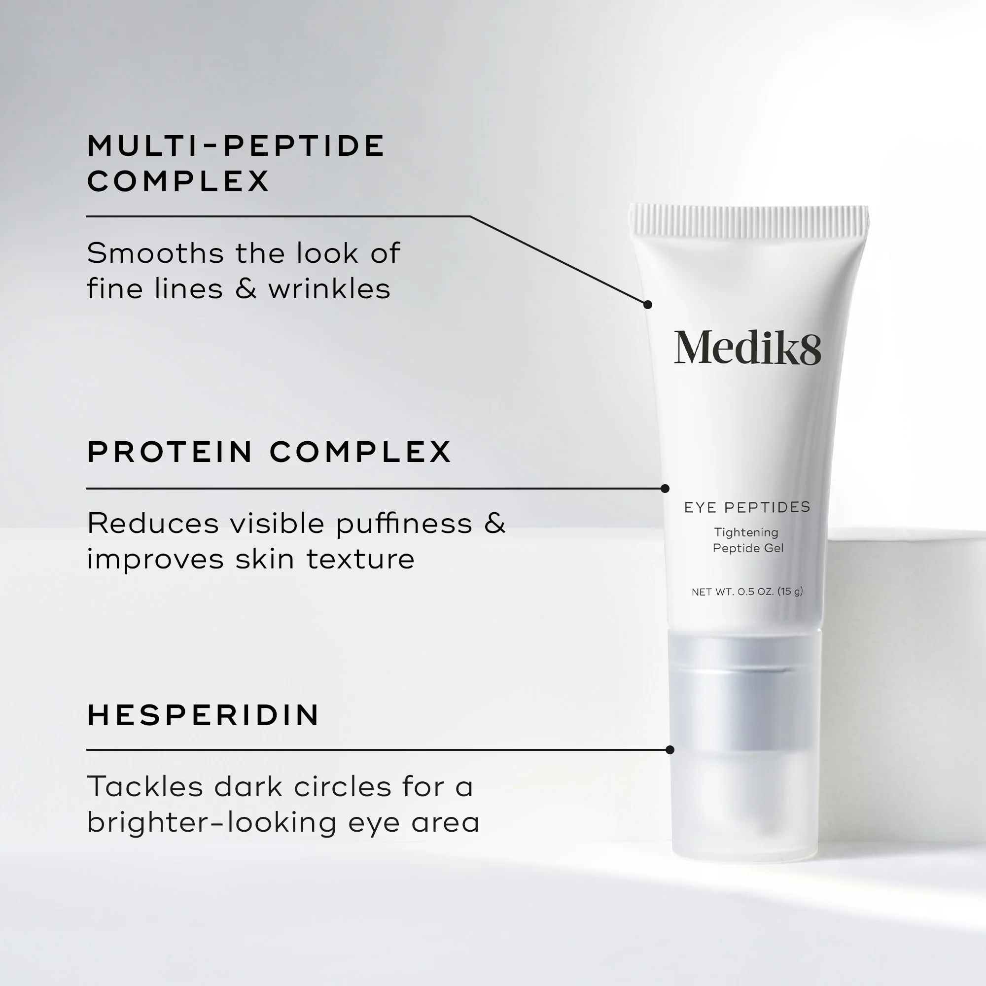 The multi-action eye serum features a unique complex of 5 age-defying peptides to visibly tackle all signs of aging around the eyes.